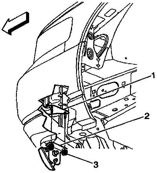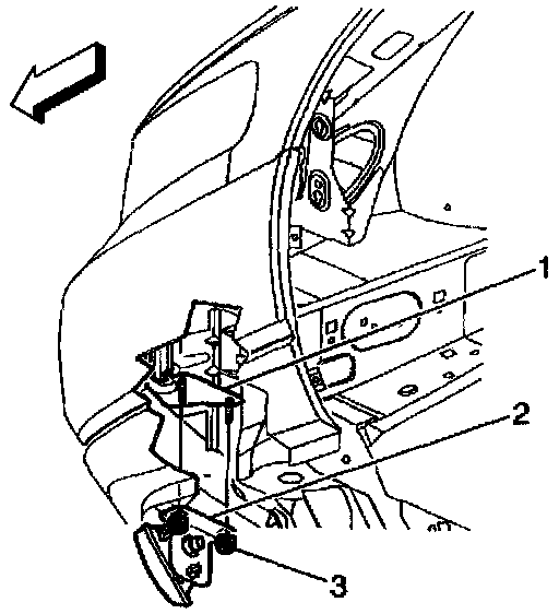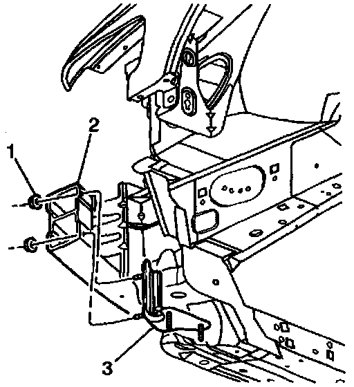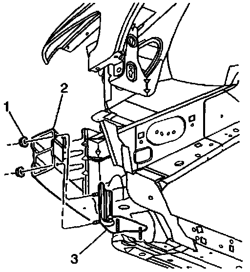 2. Install the nuts (1) to retain the fog lamp bracket (3) to the front impact bar (2).