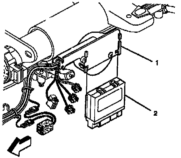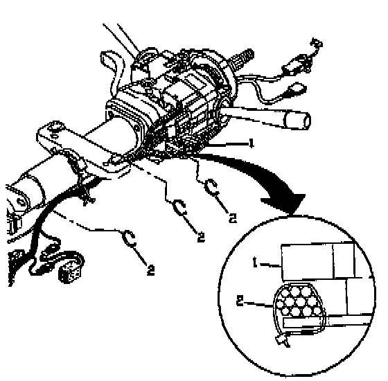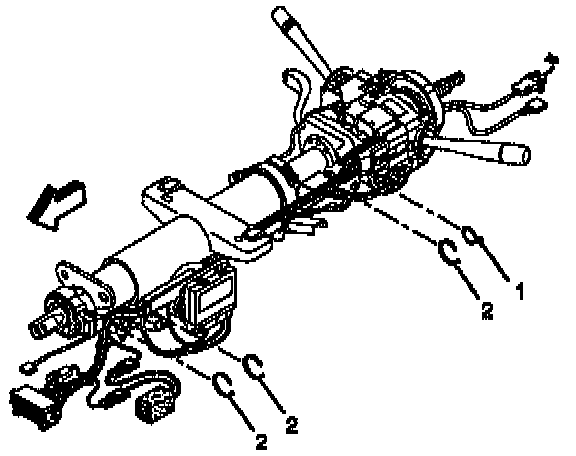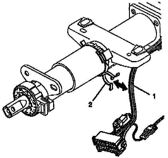 6. Install the two wire harness straps (2), Install one wire harness strap (2) to the steering column tilt head assembly (1).