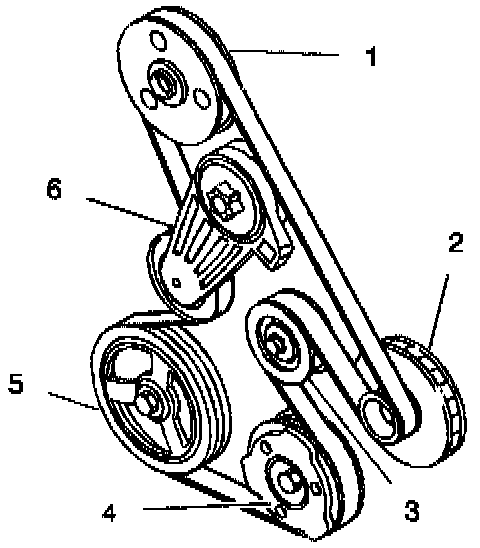 1. Thread the drive belt through all the pulleys except for the power steering pump (1) and the drive belt tensioner (6).