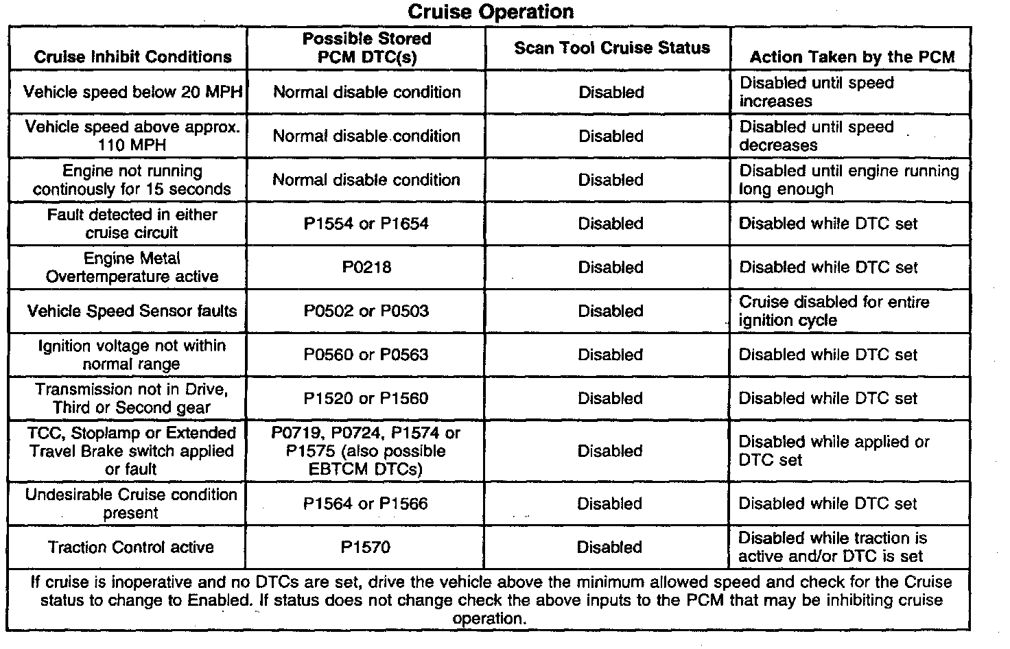Inhibit and the Cruise Engaged circuits. If the PCM will allow operation, refer to the Cruise Operation table, it signals the SMCC on the Cruise Inhibit circuit to allow cruise. Once cruise is engaged by the driver, the SMCC will continuously signal to the PCM that cruise is engaged using the Cruise Engaged circuit.