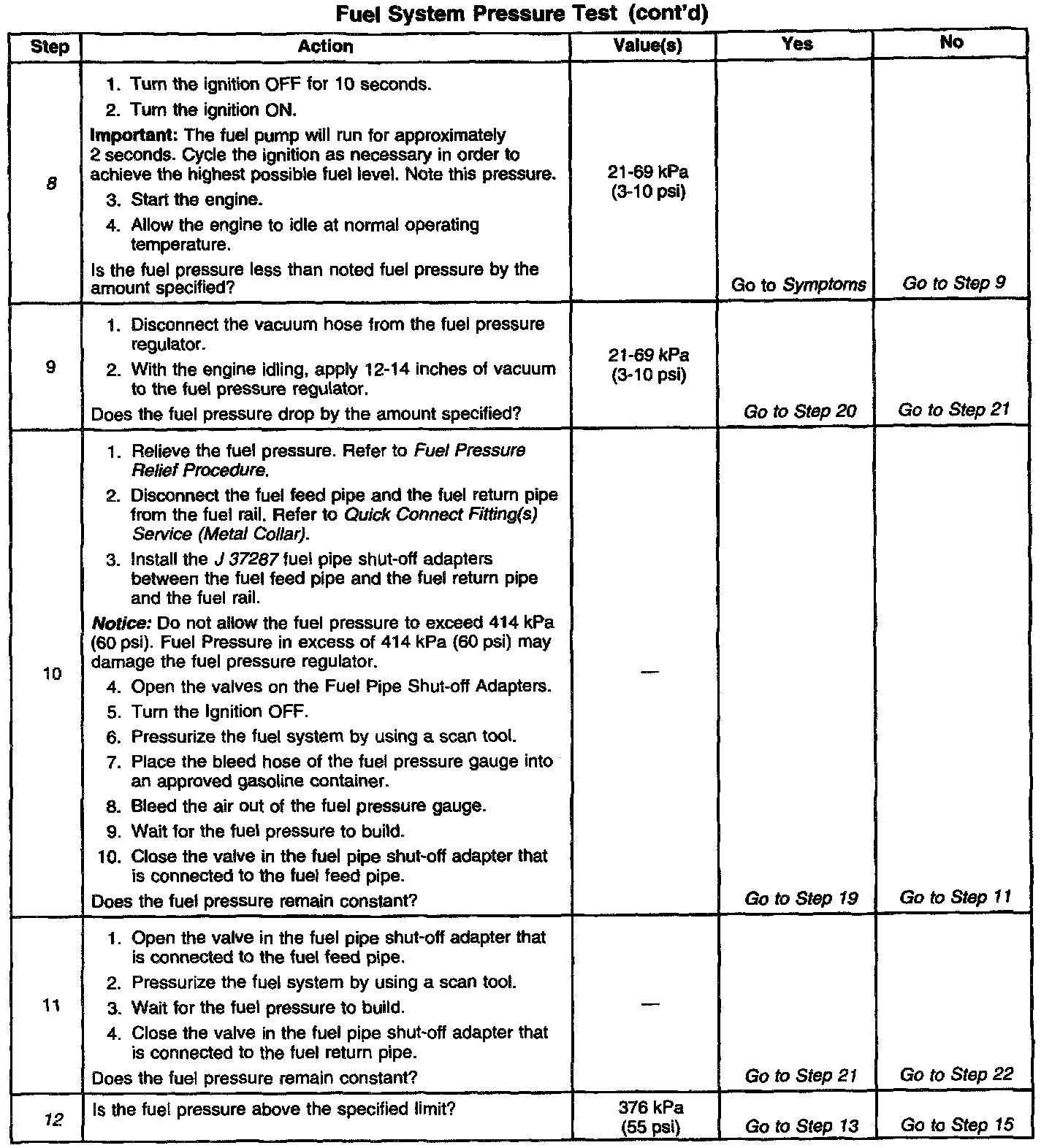16. Restricting the fuel return pipe with the Fuel Pipe Shut-Off Adapter J 37287 causes the fuel pressure to rise above the regulated fuel pressure. Using a scan tool to pressurize the system, the fuel pressure should rise above 376 kPa (55 psi) as the valve on the Fuel Pipe Shut-Off Adapter connected to the fuel return pipe becomes partially closed.