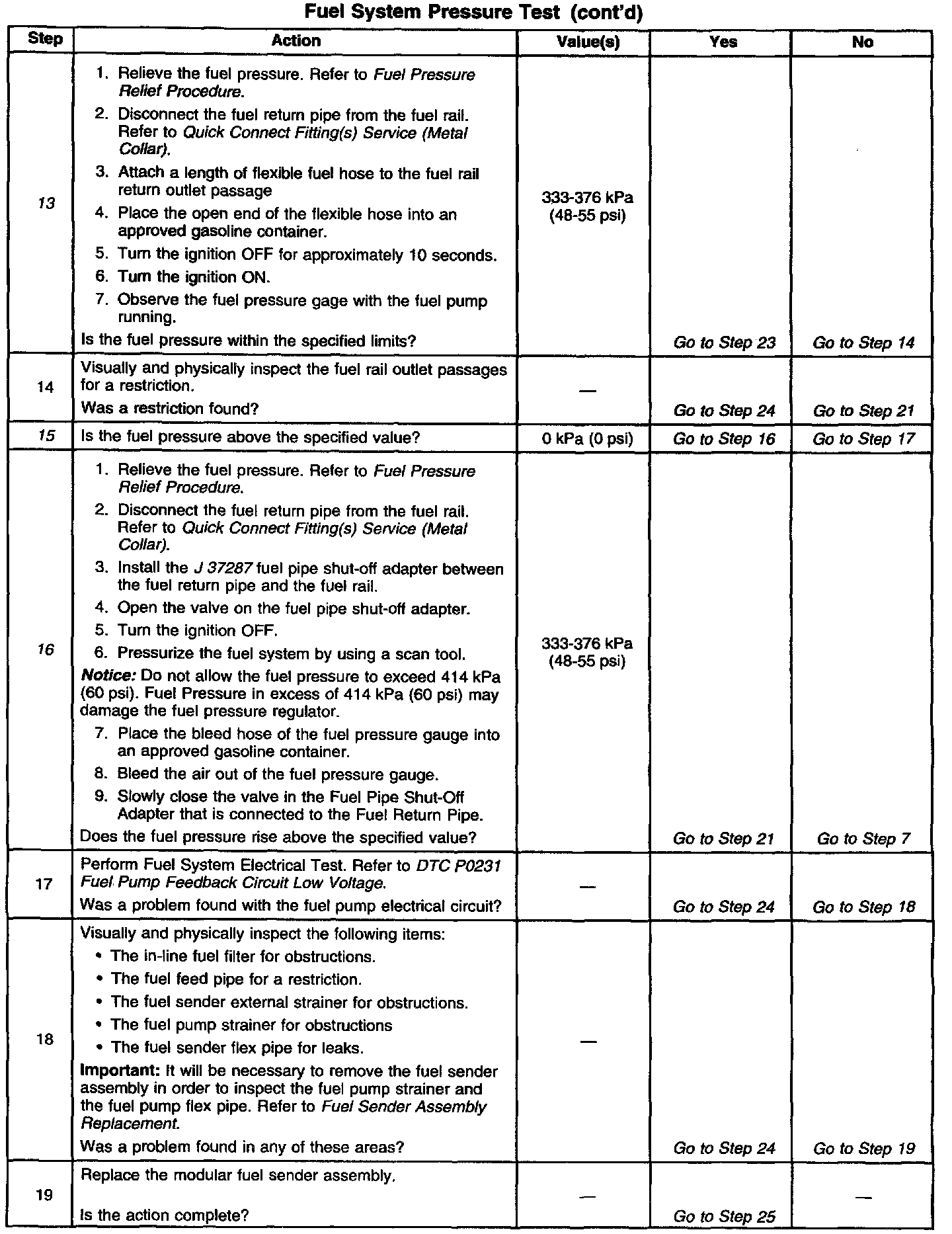 13. This test determines if the high fuel pressure is due to a restricted fuel return pipe or if the high fuel pressure is due to a faulty fuel pressure regulator.