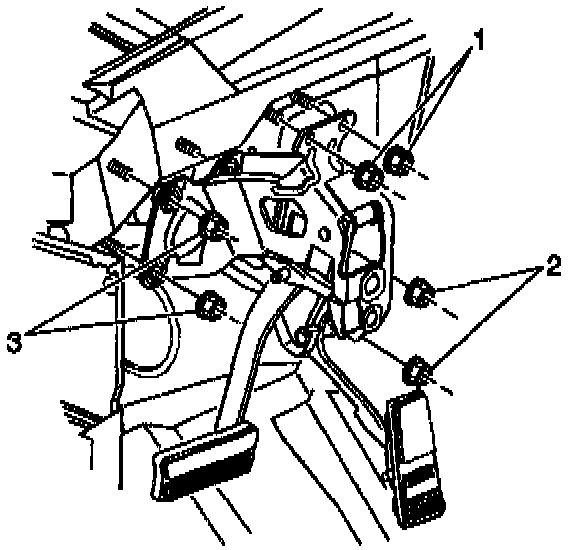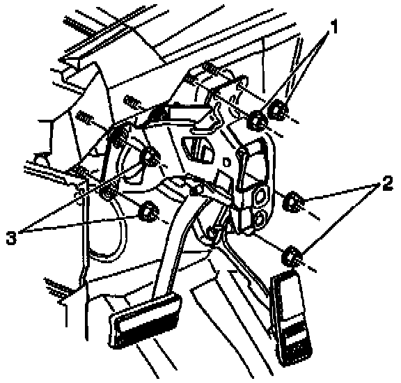 1. Install the brake pedal assembly onto the booster studs, then install the booster stud nuts (2 and 3).