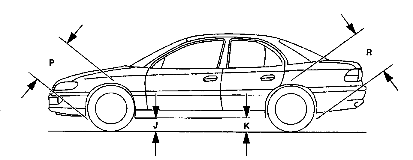 Repeat the procedure described for measuring the J and P dimensions using the rear bumper and measuring K and R at the appropriate locations. The Automatic Level Control (ALC) system must be operative while taking these measurements.