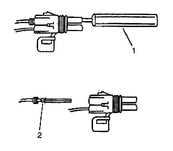 ^ Insert the Weather Pack(R) terminal removal tool into the front (mating end) of the connector cavity until it rests on the cavity shoulder (1).