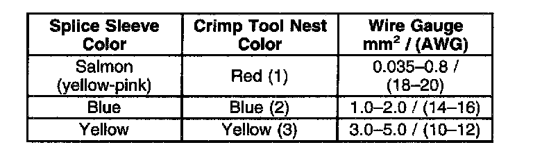 4. Select the proper sealed splice sleeve according to the wire size. Refer to the above table at the beginning of the repair procedure for the color coding of the splice sleeves and the crimp tool nests.