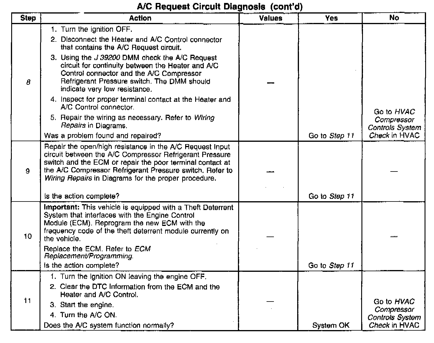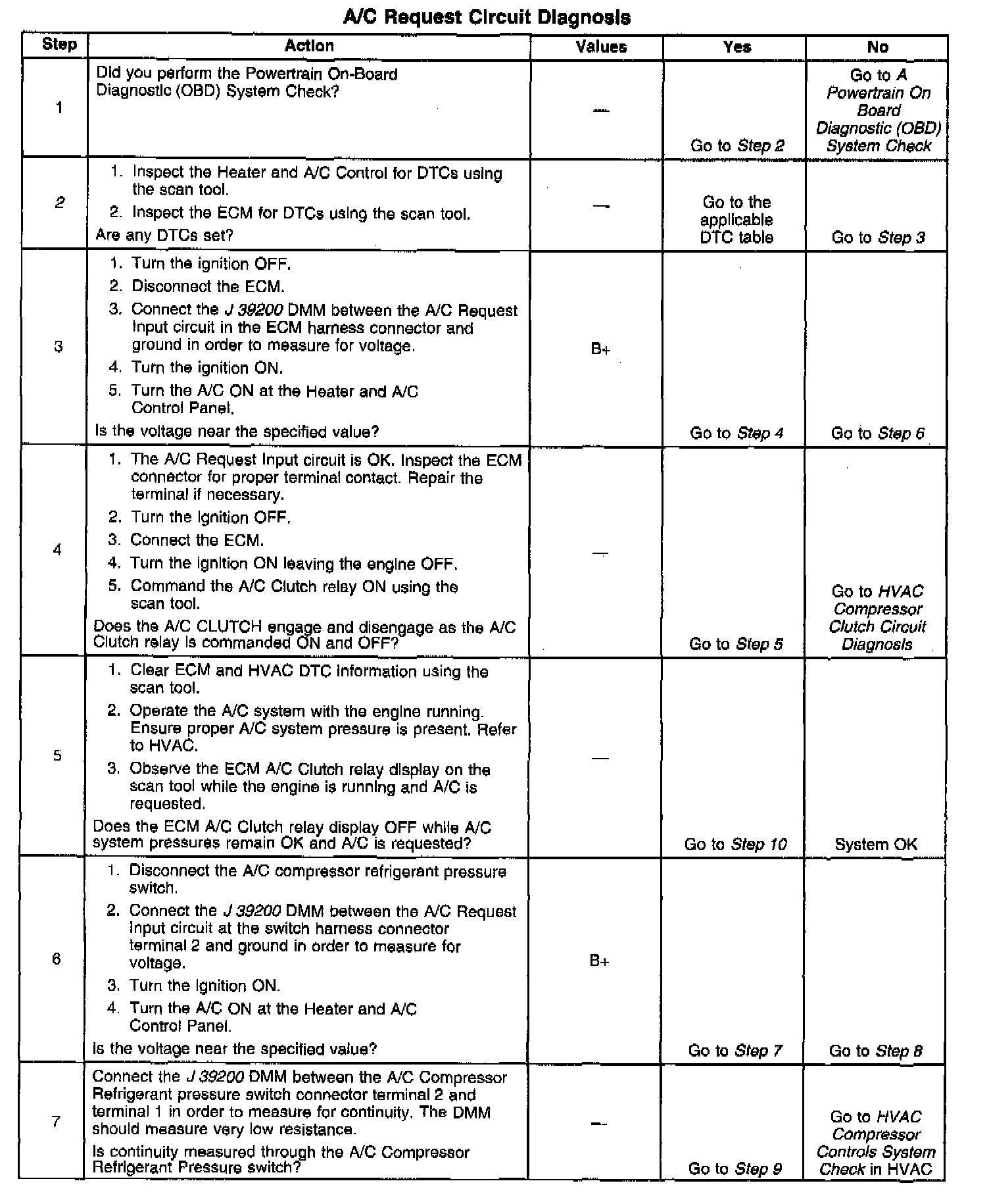 The ECM will NOT detect the A/C request signal if the A/C system pressure is too high or too low. The A/C request circuit is in series with a portion of the A/C compressor refrigerant pressure switch. The pressure activated switch contacts will open if the A/C pressure is not correct for proper A/C operation. Refer to the electrical schematic diagrams for the specific operating pressures. The heater and A/C control monitors the A/C request circuit for shorts. A shorted condition will cause an HVAC DTC to set. The ECM also monitors the A/C load switch circuit. This circuit is designed to increase the engine speed by about 50 RPM whenever a high temperature/pressure condition causes the A/C load switch contacts to close.