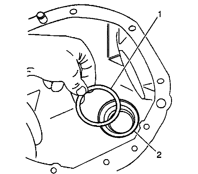 3. Remove the differential drive pinion gear shim (1) from the differential housing (2).