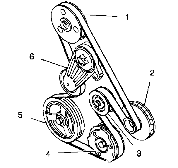 1. Thread the drive belt through all the pulleys except for the power steering pump (1) and the drive belt tensioner (6).
