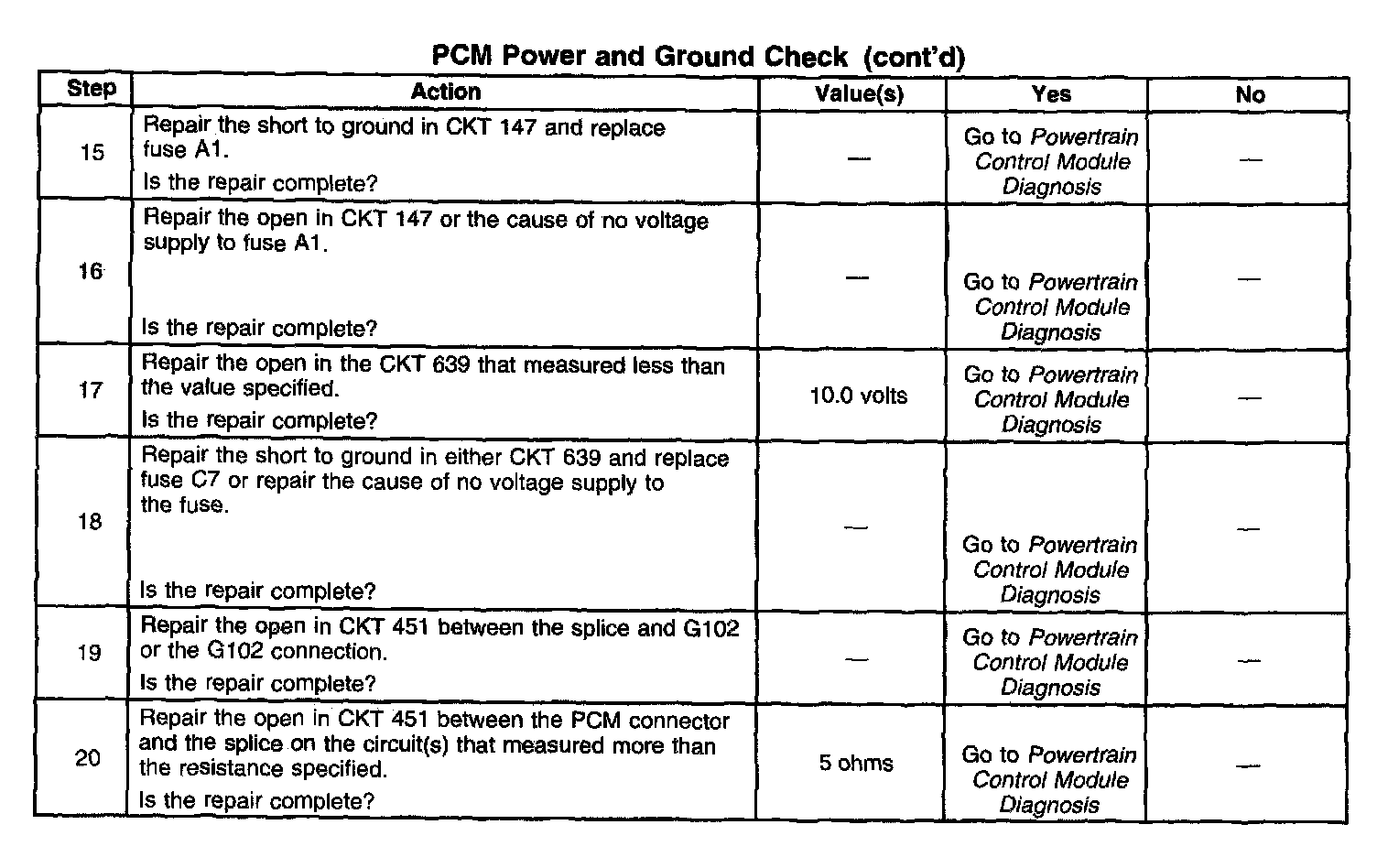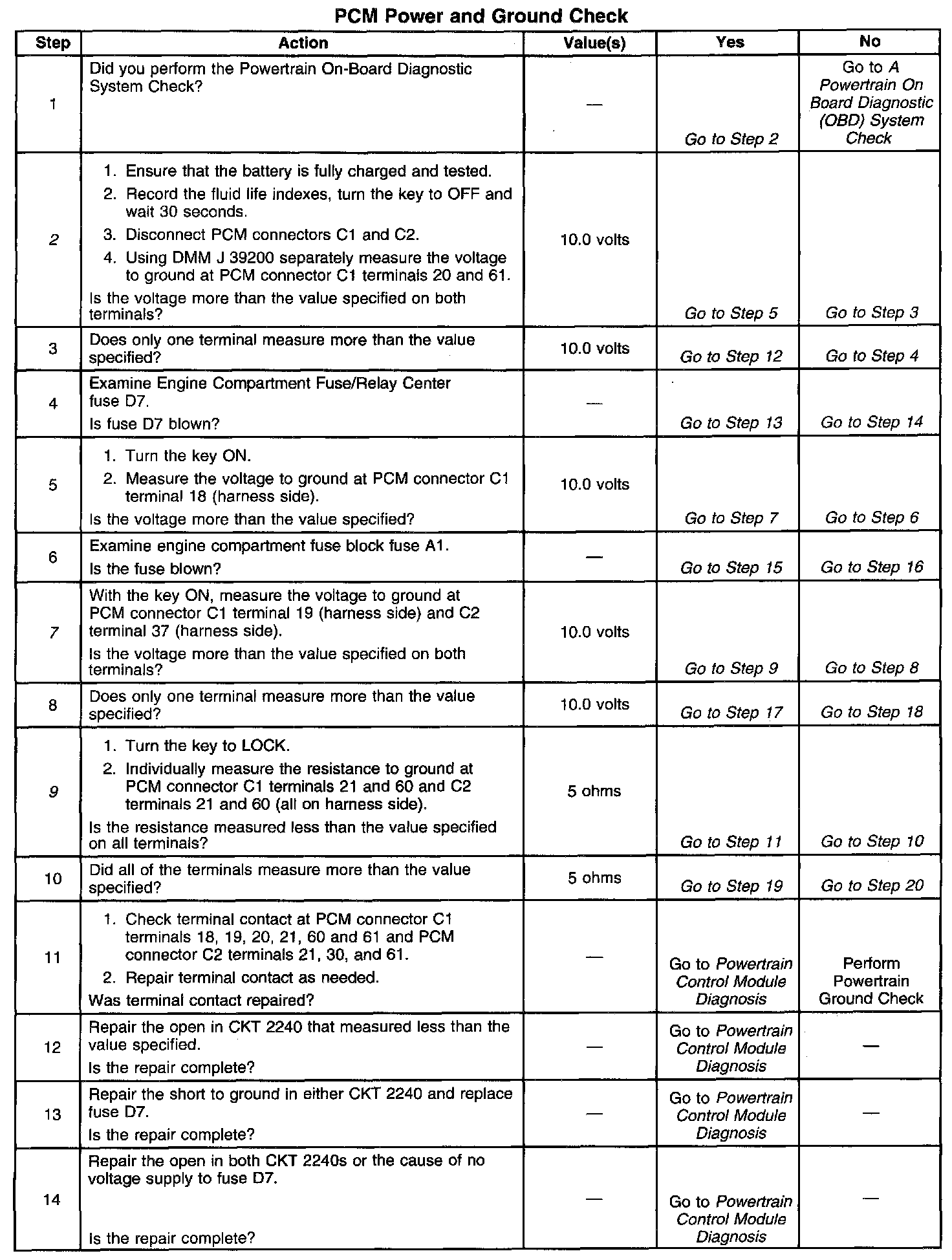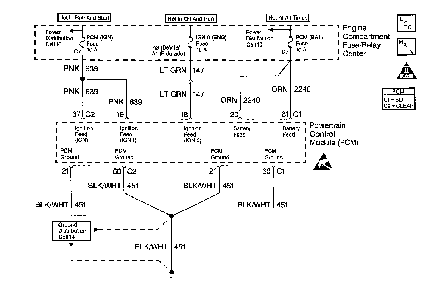 The PCM is fed battery voltage at all times at PCM connector C1 terminals 20 and 61 through CKT 2240 from the 10 amp fuse. IGN 1 voltage, Hot in Run or Start, is fed through CKT 639 and fuse C7 to PCM connector C1 terminal 19 and C2 terminal 37. IGN 0 voltage (Hot in all positions except LOCK) is fed through fuse A1 to PCM connector C1 terminal 18. The PCM needs all of these inputs to function properly. The PCM also has four grounding pins: at terminals 21 and 60 of both PCM connectors C1 and C2. These terminals are grounded through CKT 451 to ground G102.