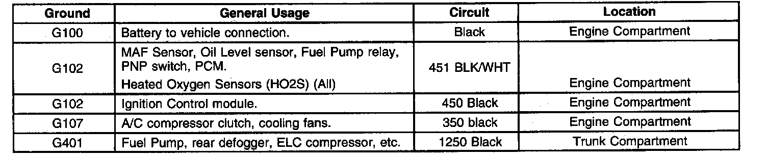 There are several vehicle grounds that are essential for proper powertrain system operation. Loose or poor ground connections may cause widely varying problems, from flickering telltales to PCM DTCs to driveability problems. The Powertrain Ground Check should be performed when referred to by other diagnostics or when erratic or intermittent problems defy traditional diagnosis. The Powertrain Ground Check table lists these grounds and other pertinent information that will allow you to investigate a possible loose or faulty ground connection.