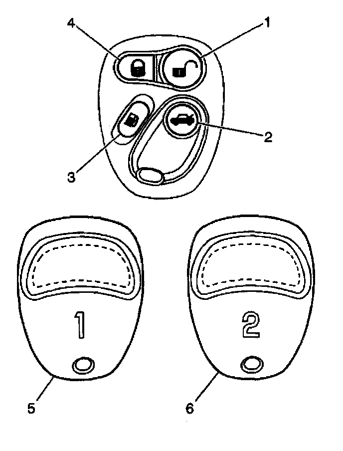 ^ The RFA module recognizes each transmitter individually. The module sets the programmable features to the correct setting for each transmitter. There may be 2 number 1(5) and 2 number 2 (6) transmitters per vehicle.