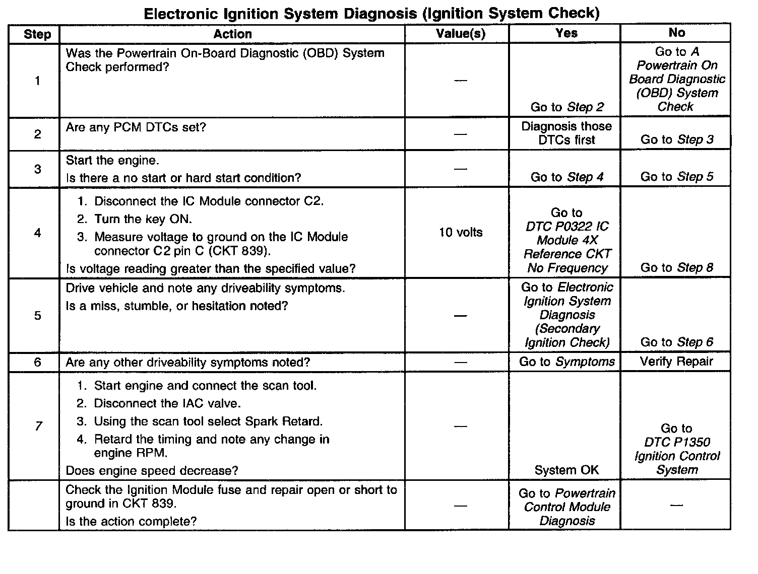 When any condition is suspected to be caused by or related to the Ignition System, the first step in diagnosis should be to check for stored PCM DTC's. Diagnose all DTC's before further action is taken. The Ignition System Check provides a means of testsing ignition system performance and references other tables for specific ignition system conditions.
