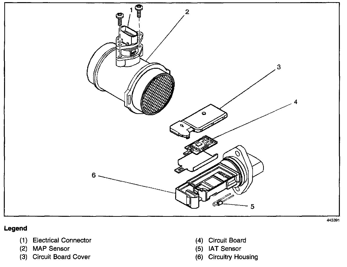 The MAF sensor that is used on this vehicle is a hot film type and is used in order to measure the air flow rate. The MAF output voltage is a function of the power required to keep the air flow sensing elements at a fixed temperature above the ambient temperature. The air flowing through the sensor cools the sensing elements. The amount of cooling is proportional to the amount of air flow. As the air flow increases, more current is needed in order to maintain the hot film at a constant temperature. The MAF sensor converts the changes in the current draw to a voltage signal that is read by the Engine Control Module (ECM). The ECM calculates the air flow based on this signal.
