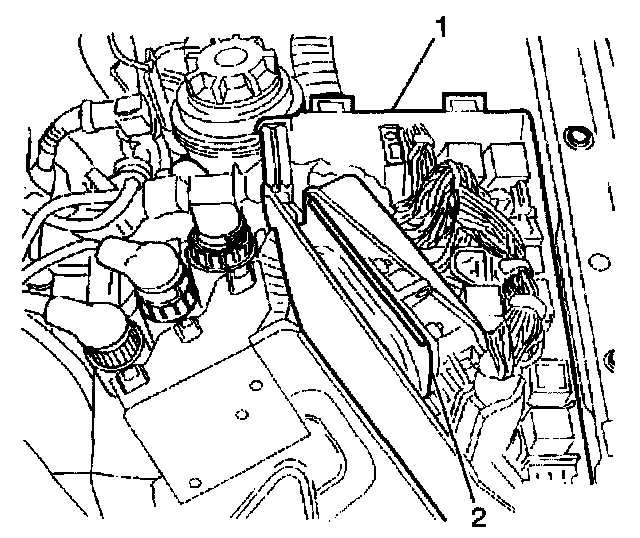 3. Remove the Engine Control Module (ECM) (2) from the relay center (1). Move the ECM harness to one side.