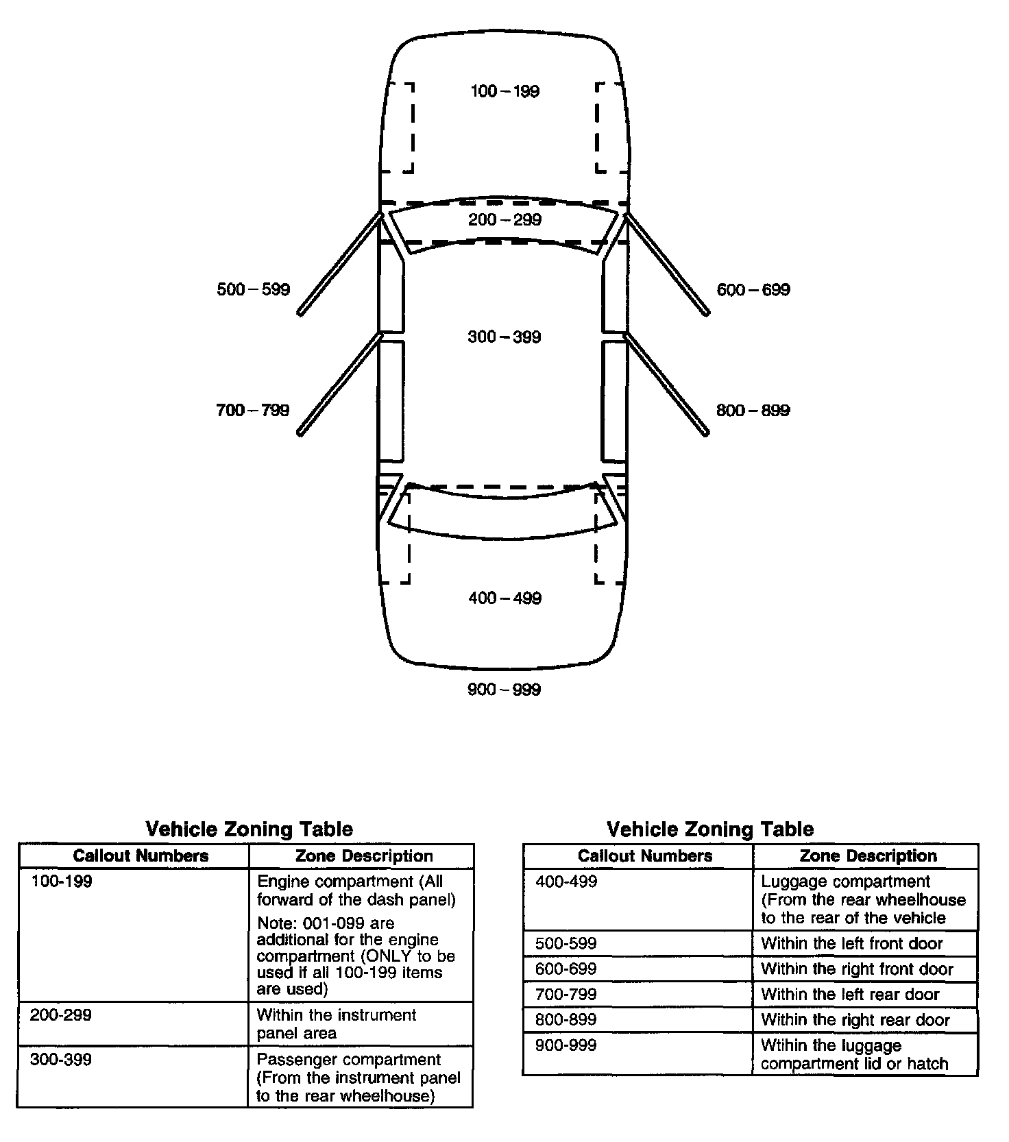All grounds, in-line connectors, pass-through grommets, and splices have identifying numbers that correspond to where they are located in the vehicle. The following table explains the numbering system.