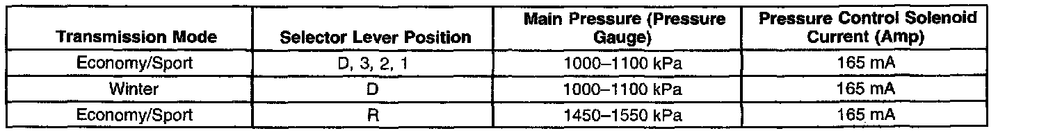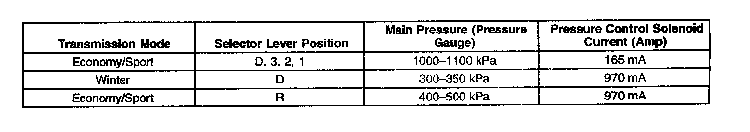 2. Compare the scan tool value for the pressure control solenoid current consumption and the transmission fluid pressure from the pressure gauge with the relevant values in the Mode vs Pressure at Stall Speed Table below.