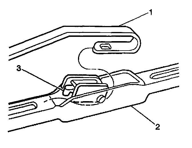 2. Depress the locking tab (3) in the middle of the wiper blade (2), near the arm (1).