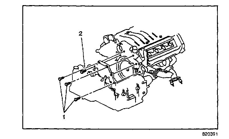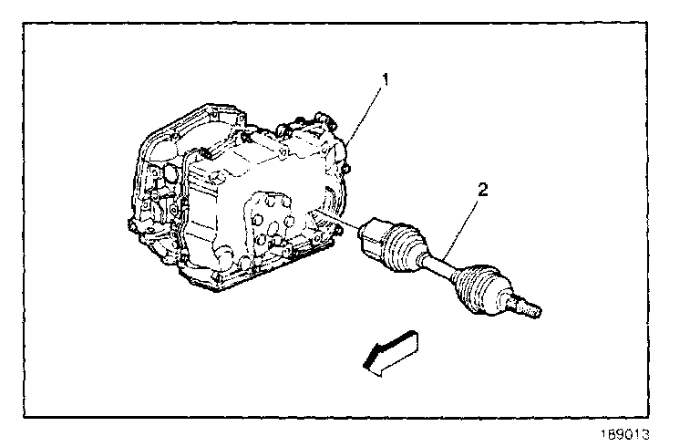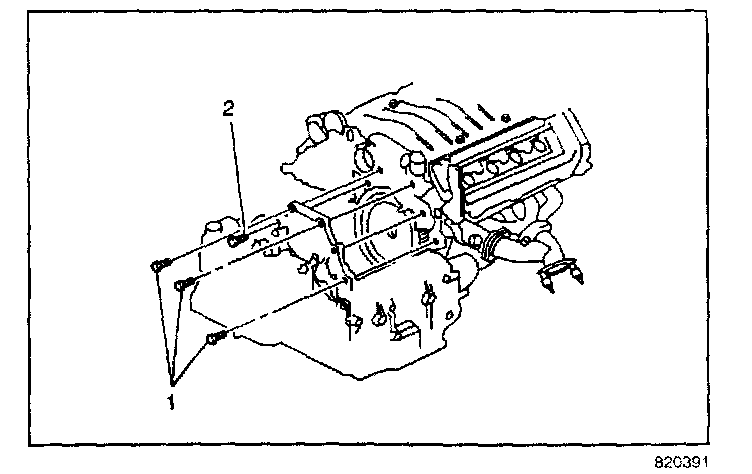7. Align the transaxle with the engine and position the transaxle onto the engine dowels. Install the engine to transaxle bolt (2).