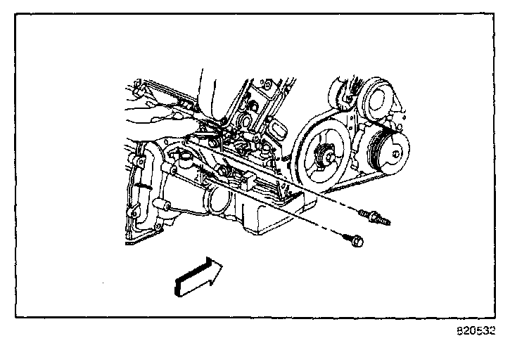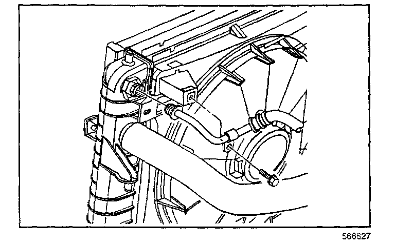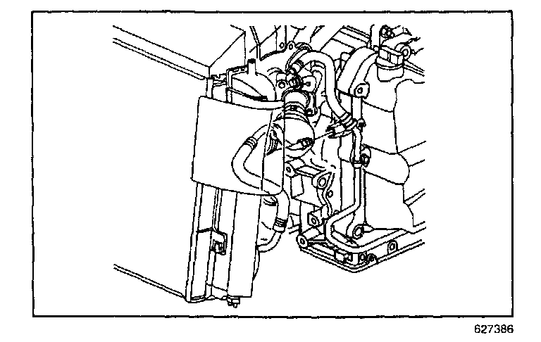31. Install the upper transaxle oil cooler pipe retaining bolt to the fan shroud.