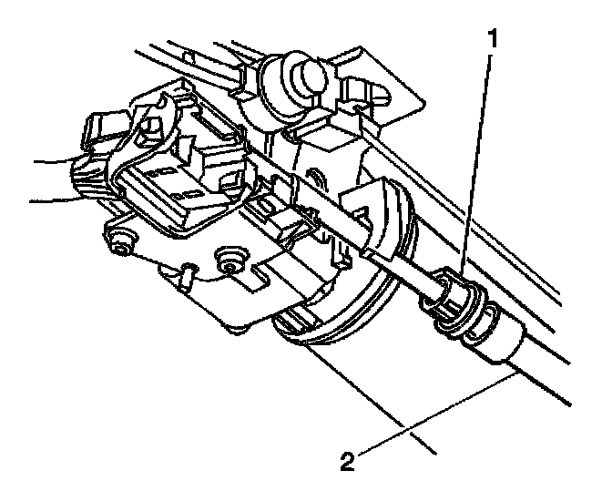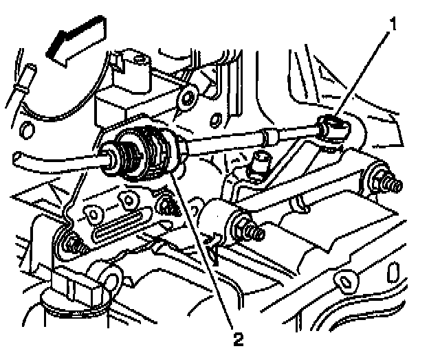3. Disconnect the transaxle range selector cable terminal from the transaxle manual shift lever pin (1). Press the locking tabs inward in order to release the transaxle range selector cable (2) from the bracket.