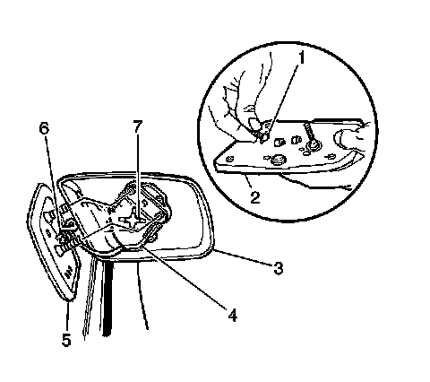 1. Snap the rear view mirror adjuster ball studs (1) into the new mirror backing plate (2).