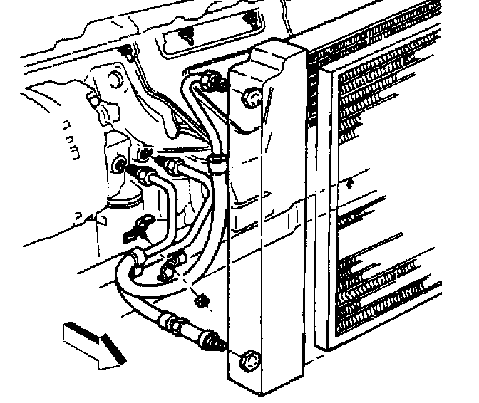 64. Connect the transmission cooler lines to the radiator. Install the forward discriminating sensor to the radiator support.