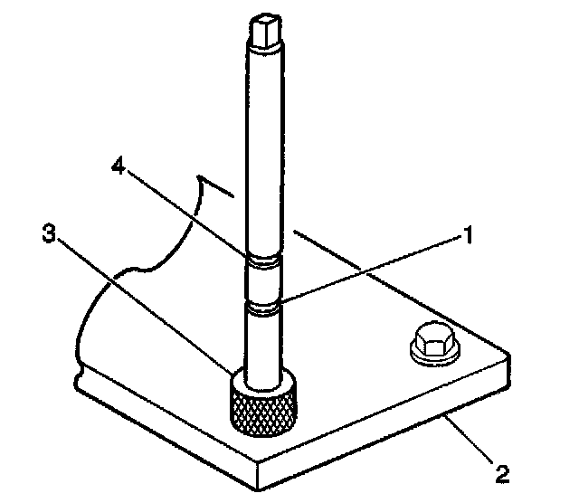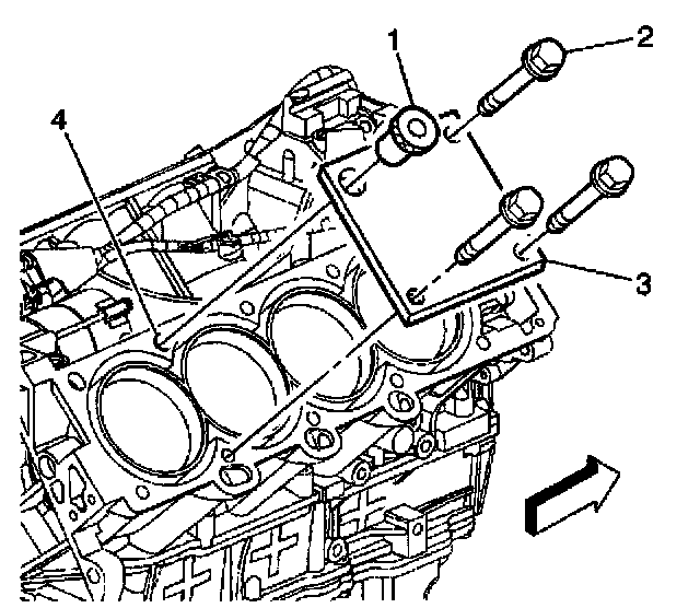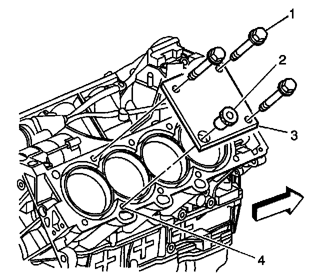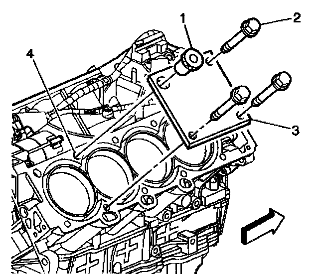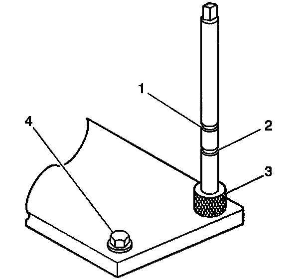 1. Position the fixture plate (3) with the bushing (1) installed over the cylinder head bolt hole to be repaired (4).