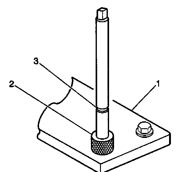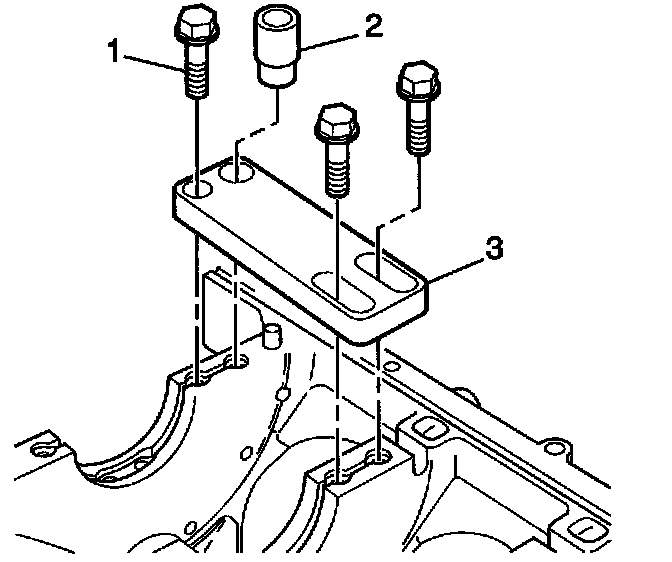 1. Position the fixture plate (3) with the bushing (2), installed over the crankshaft main cap bolt hole to be repaired.