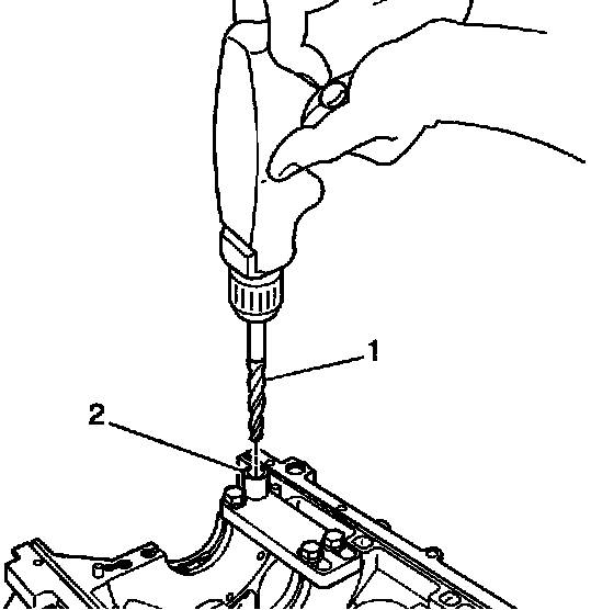 Important: Drill the crankshaft main bolt hole until the mark (1) on the drill aligns with the top of the drill bushing (2).