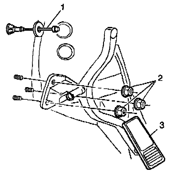 3. Remove the nuts (2) from the accelerator controls pedal assembly (3).