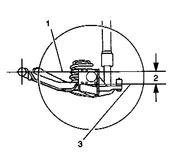 8. Measure the distance between the lowest point on the ball joint housing and the centerline of the control arm bolt. This distance (3) should be 40 mm (1.57 inch).