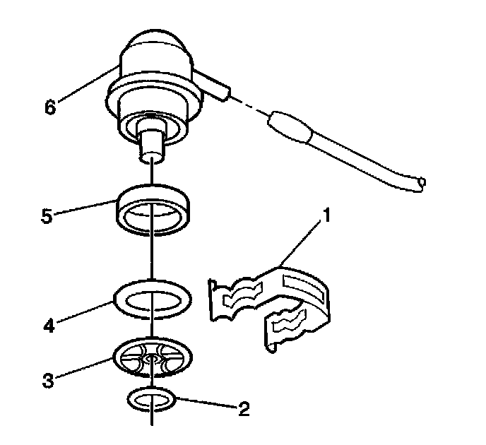 4. Remove the retainer clip from the fuel pressure regulator (6).