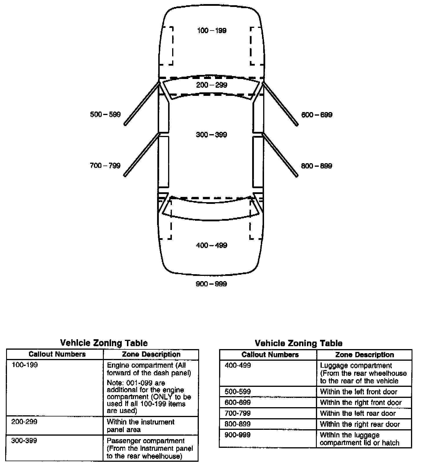 All grounds, in-line connectors, pass-through grommets, and splices have identifying numbers that correspond to where they are located in the vehicle. The above table explains the numbering system.