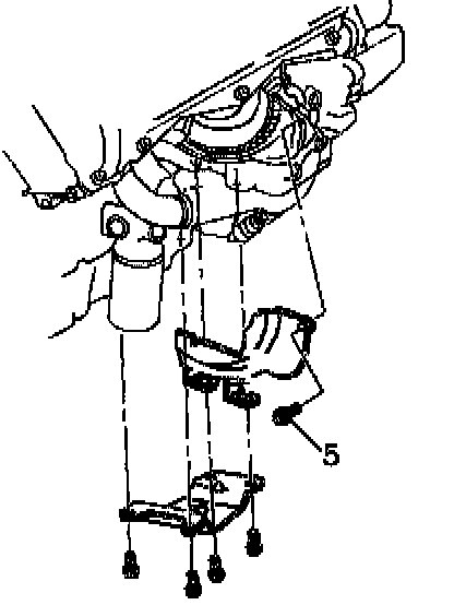 2. Install the engine-to-transmission brace and attaching bolts (5).