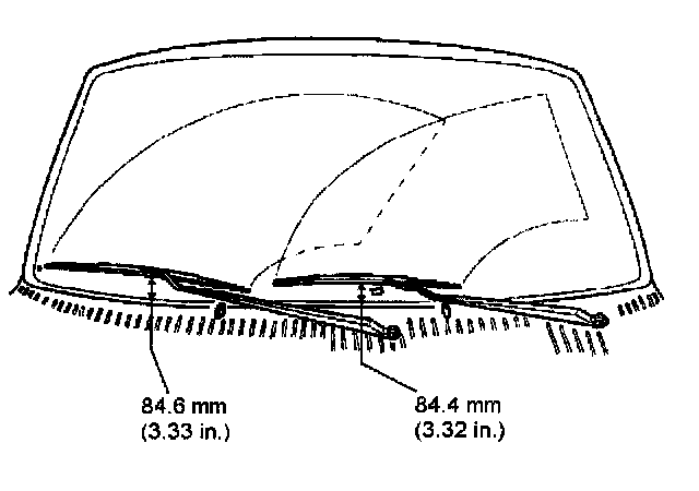 3. Install the wiper arm on the wiper transmission drive shaft while maintaining the following distances between the end of the wiper blade and the bottom of the windshield: