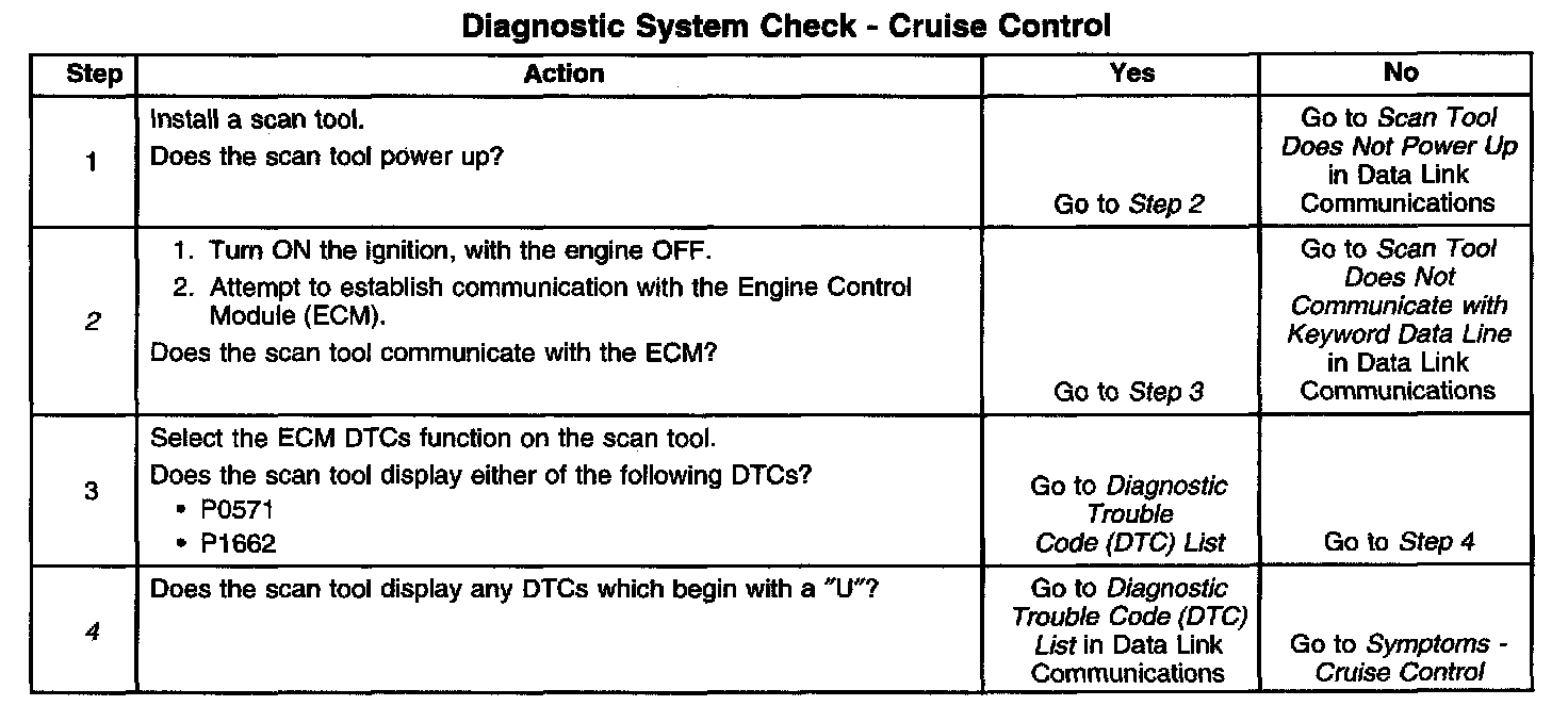 DESCRIPTIONThe Cruise Control Diagnostic System Check is an organized approach to identify a condition created by an electronic control system malfunction. The Diagnostic System check directs the service technician to the next logical step in diagnosing the concern. Understanding the system, the table and using it correctly reduces diagnostic time and prevents misdiagnosis. For a review of the cruise control system refer to Cruise Control Description and Operation.