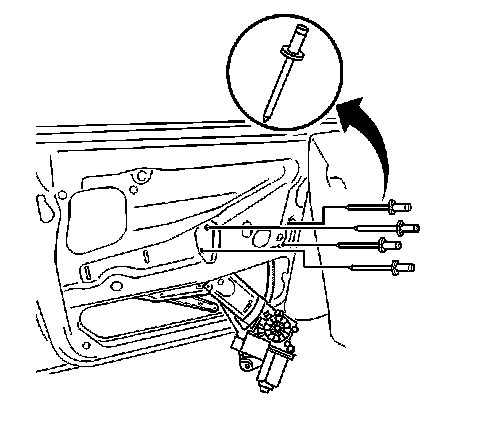 8. Remove the guide rail adjuster. Refer to Window Guide Rail Replacement - Front Door (Window Guide Rail Replacement - Front Door).