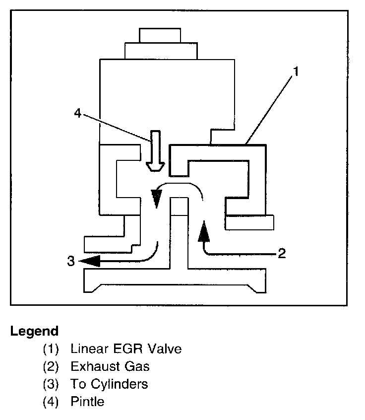 The EGR valve is designed to supply EGR to the engine. The EGR valve consists of a sealed bobbin and coil assembly, or solenoid. Inside the solenoid is a sleeve-armature assembly that contains a pintle and valve, two seals, retaining washers, a seal spring, and armature spring, and a bearing. The bearing seals the pintle valve shaft from the exhaust chamber. Also, a shield, held in place by a compression spring, deflects exhaust gas from the shaft and armature.