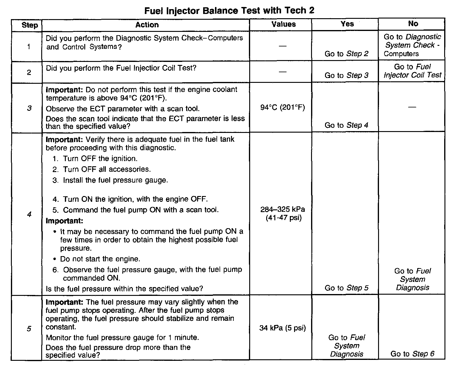 5. The fuel pressure should reach a steady value. Refer to Fuel System Diagnosis if the fuel pressure does not stabilize. Component Tests and General Diagnostics