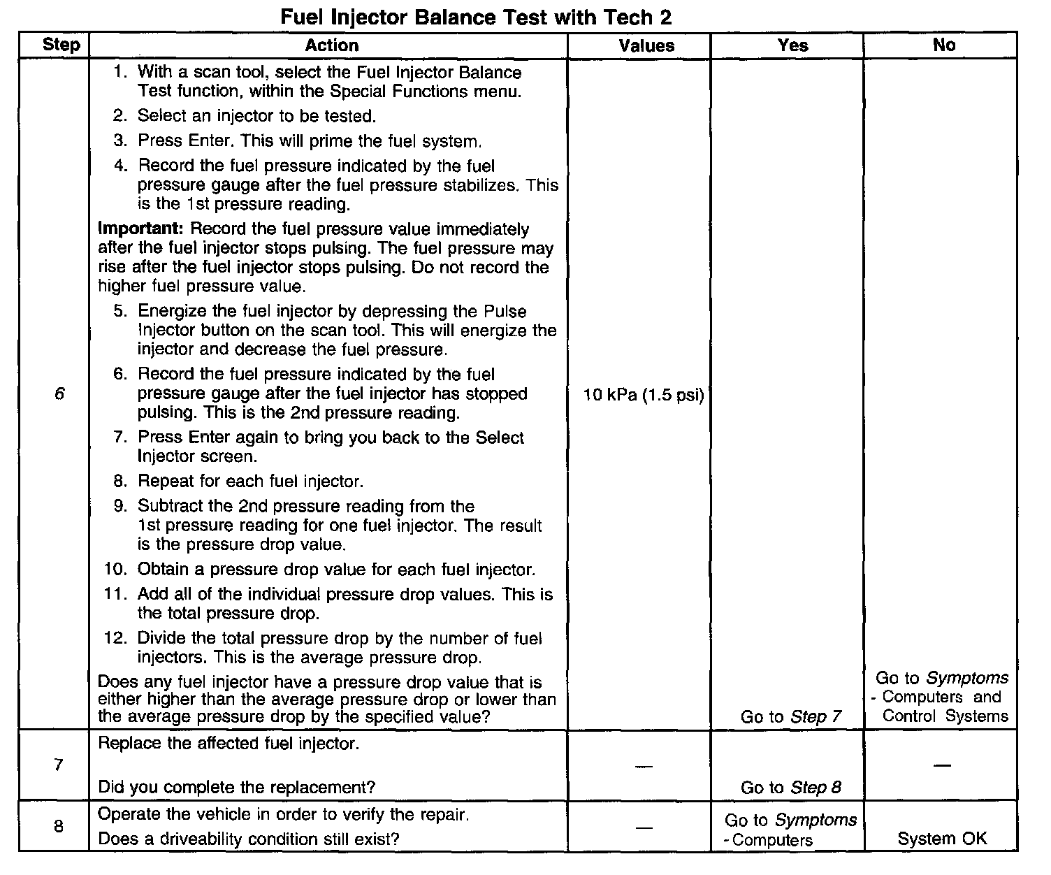 6. If the pressure drop value for each fuel injector is within 10 kPa (1.5psi) of the average pressure drop value the fuel injectors are flowing properly. Calculate the pressure drop value for each fuel injector by subtracting the second pressure reading from the first pressure reading.