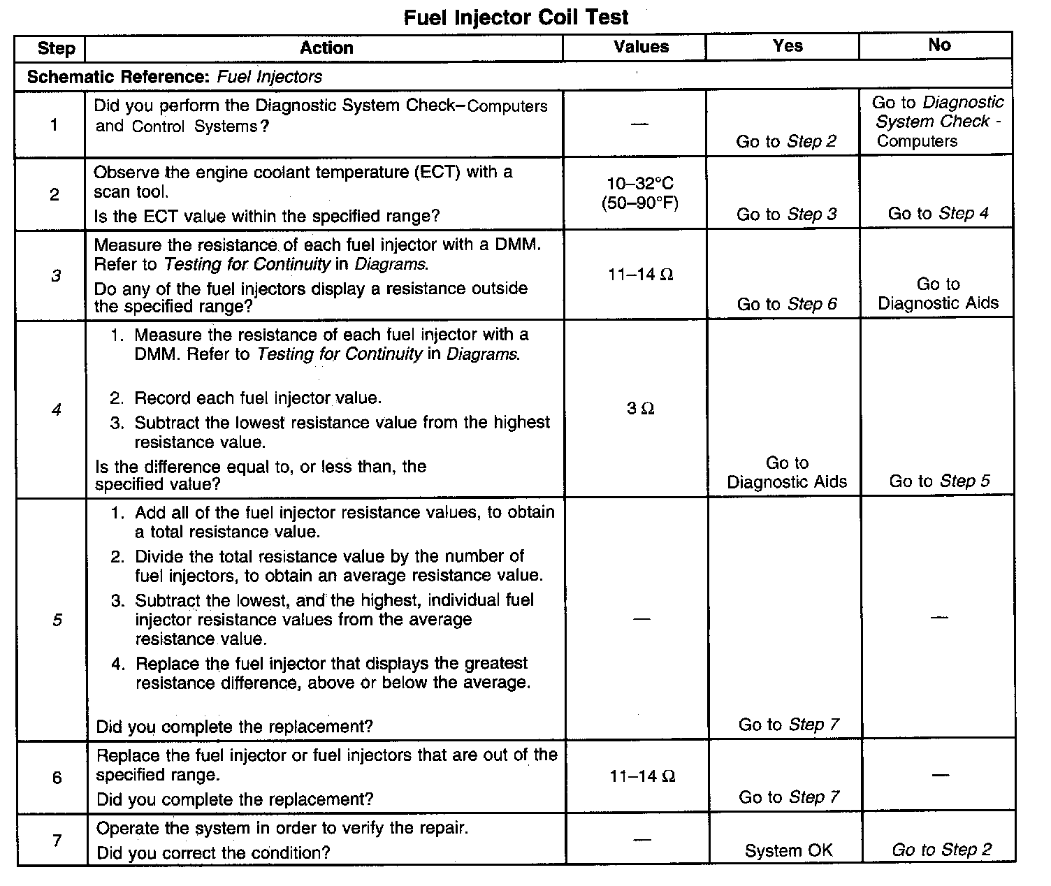 4. This step determines if all of the fuel injectors are within 3 Ohms of each other. If the highest resistance value is within 3 Ohms of the lowest resistance value, then all of the fuel injector coil windings are OK.