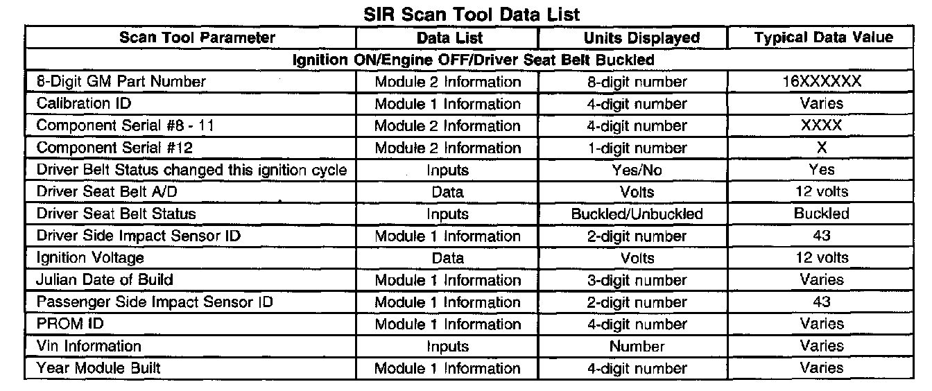 The SIR Scan Tool Data List contains all the restraint system related parameters that are available on the scan tool. The parameters in the list are arranged in alphabetical order. The column, "Data List," indicates the location of the parameter within the scan tool menu selections.