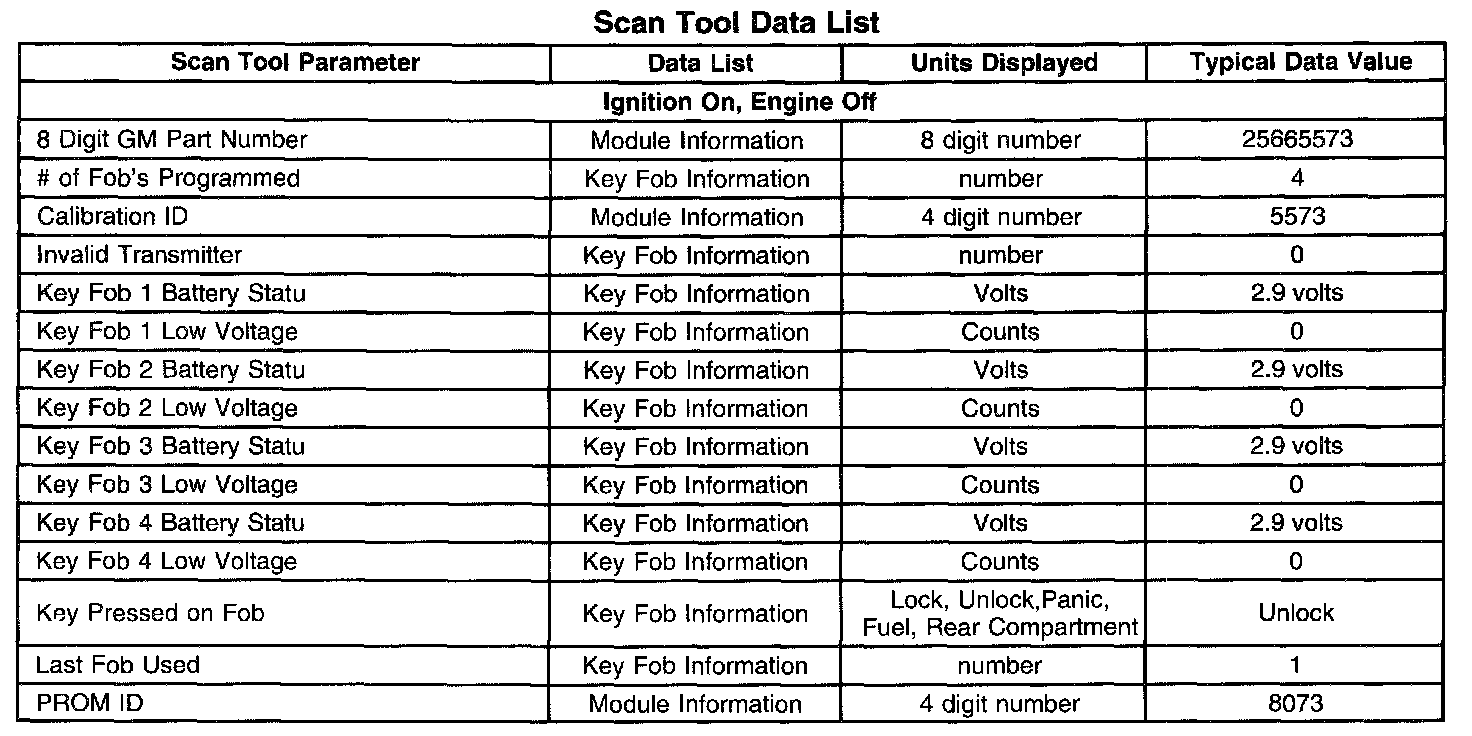 The Keyless Entry Scan Tool Data List contains all of the keyless entry related parameters that are available on the scan tool. The parameters in the list are arranged in alphabetical order. The column, Data List, indicates the location of the parameter within the scan tool menu selections. Use the Keyless Entry Scan Tool Data List as directed by a diagnostic table or in order to supplement the diagnostic procedures. Begin all of the diagnostic procedures with Diagnostic System Check - Remote Keyless Entry. Use the Scan Tool Data List only after the following is determined: