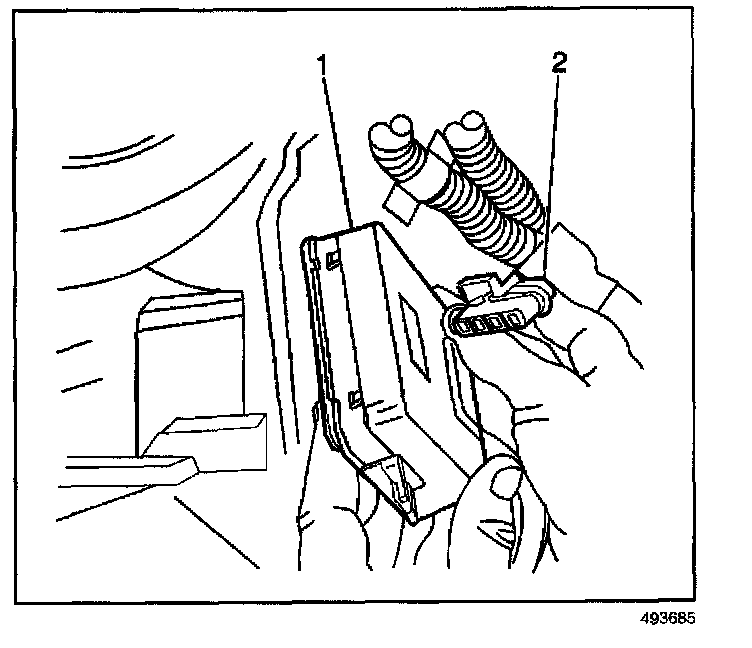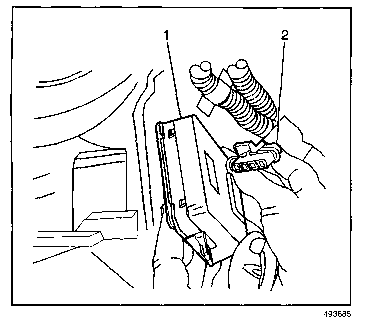 7. Remove the electrical connector (2) from the blower motor control module (1).