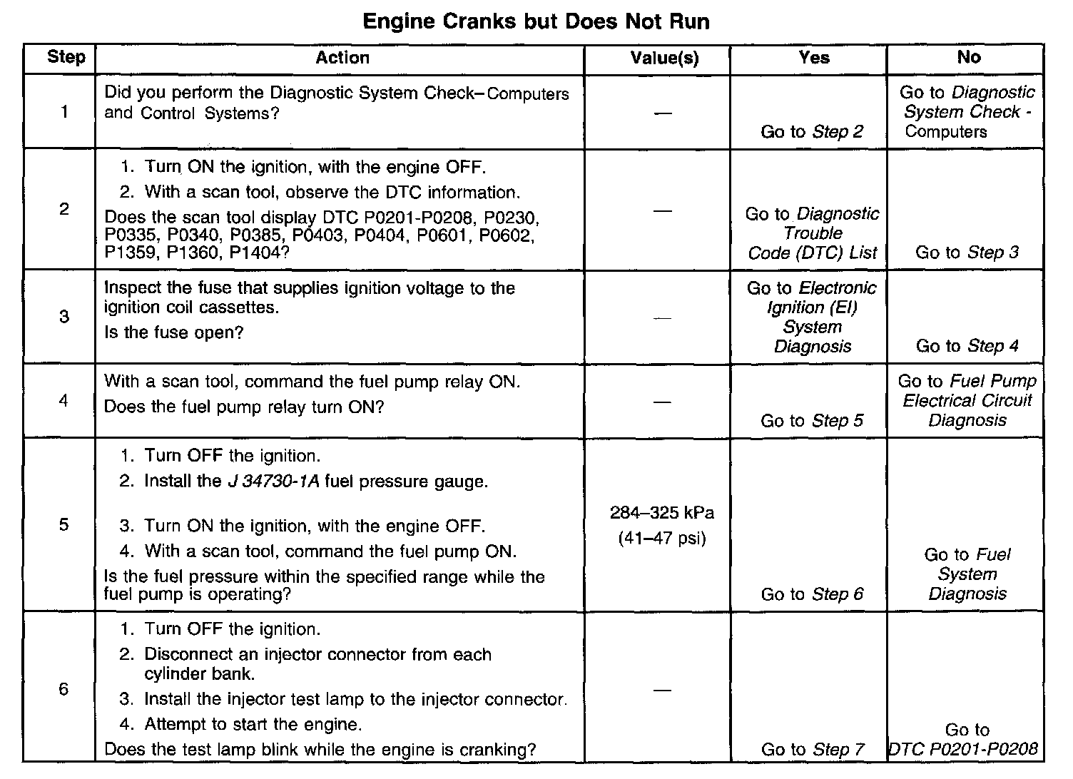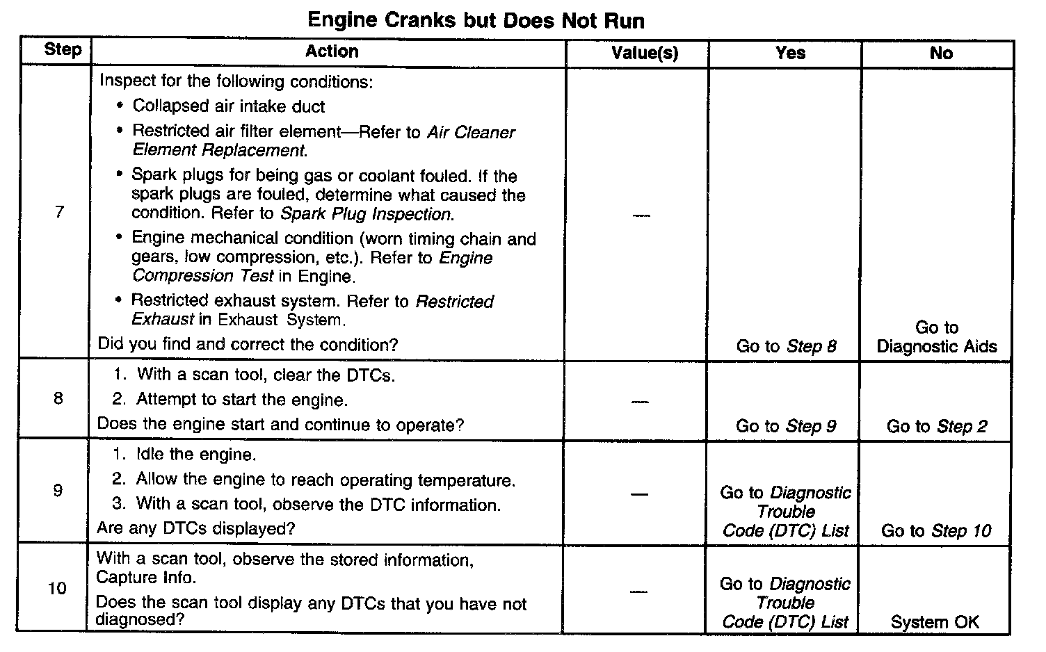 To prevent mis-diagnosis, perform Diagnostic System Check - Computers and Control Systems before performing this table. Unless the engine enters Clear Flood at the first indication of a flooding condition, a no start may result. Be sure to check the spark plugs for signs of fouling.