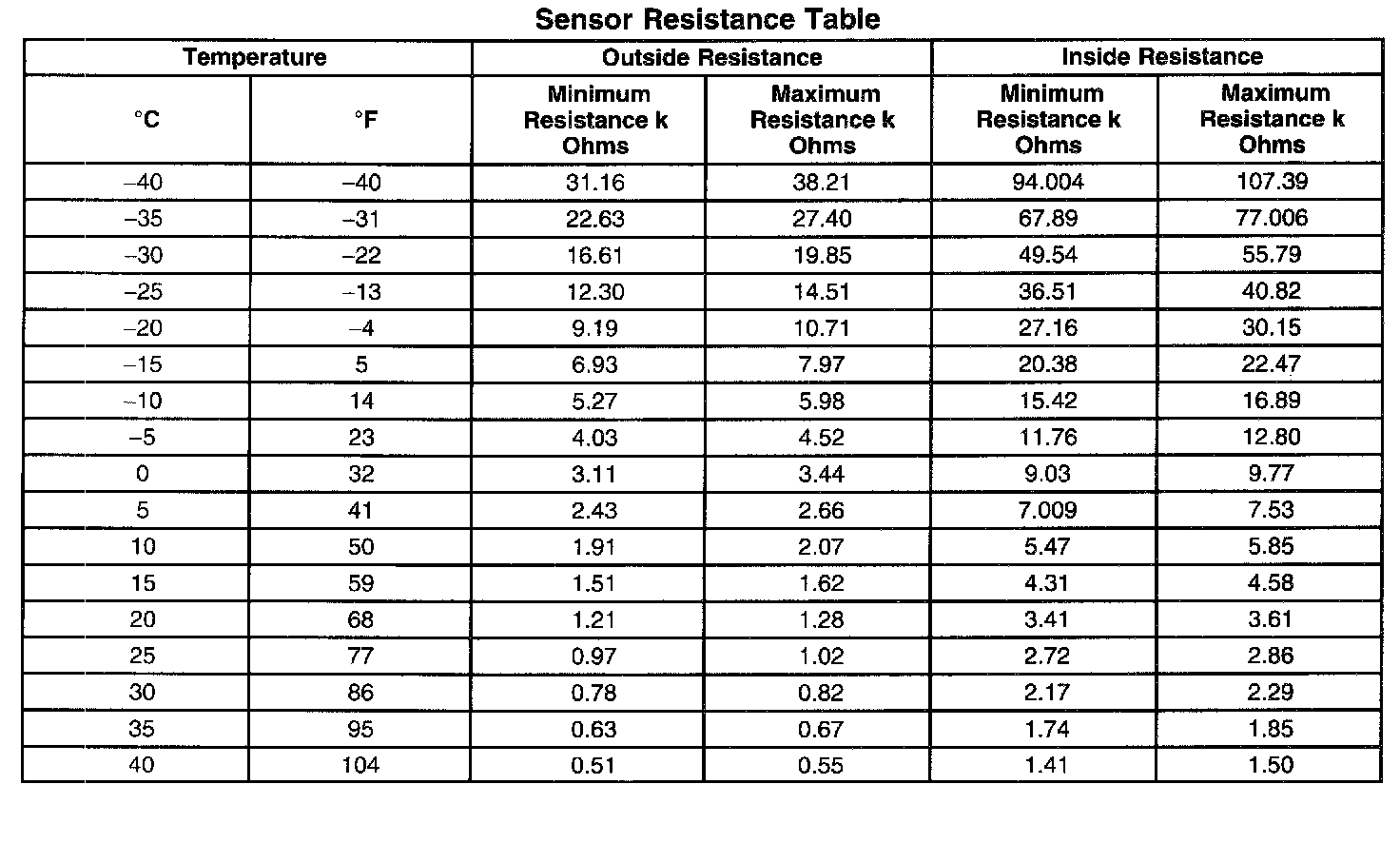 Sensor Resistance Table