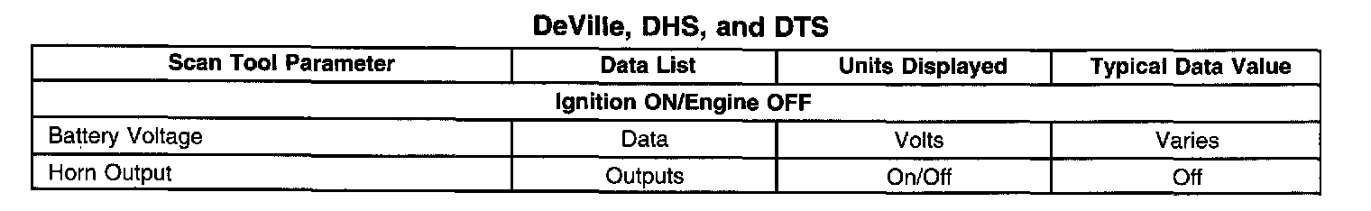 The Horns Scan Tool Data List contains all of the horns related parameters that are available on the scan tool. The parameters in the list are arranged in alphabetical order. The column, "Data List," indicates the location of the parameter within the scan tool menu selections. Use the Horns Scan Tool Data List as directed by a diagnostic table or in order to supplement the diagnostic procedures. Begin all of the diagnostic procedures with Diagnostic System Check - Horns.