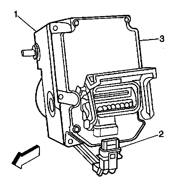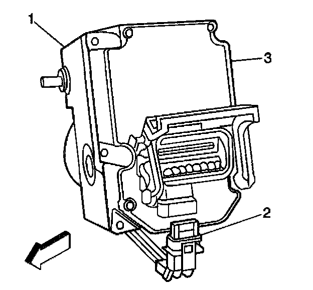 4. Connect the BPMV pump motor harness pigtail electrical connector (2) to the EBCM (3).