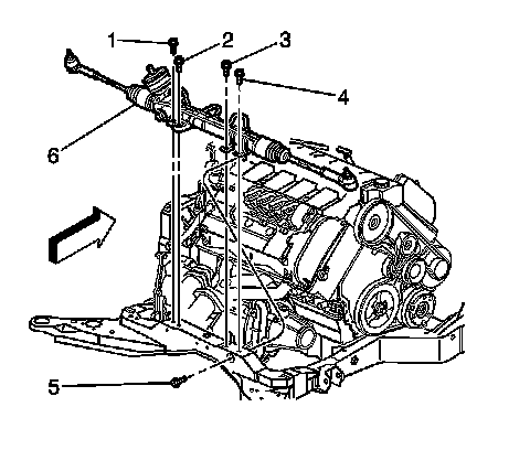 9. Remove the fasteners (1,2,3,4) and the horizontal fastener (5) retaining the rack and pinion (6) to the engine frame. Refer to Steering Gear Replacement in Power Steering Systems.